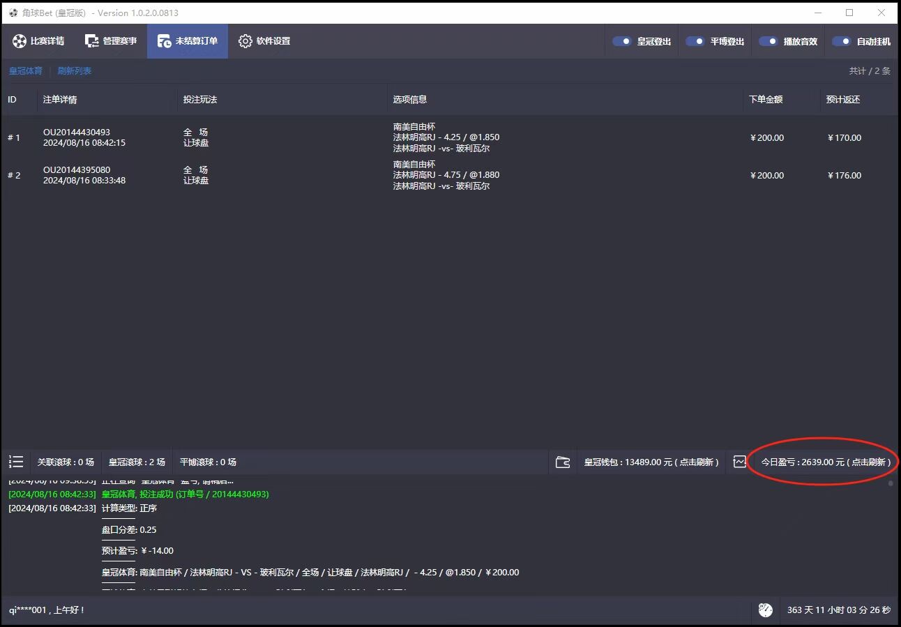 全自动挂机运行,解放双手: 告别繁琐的手动操作,软件实现全自动挂机运行,24小时不间断扫描赔率、分析数据、下单交易,即使你不在电脑前,也能轻松获取收益。